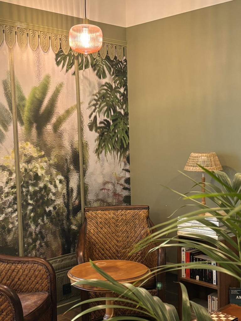Les murs vert olive servent d’écrin à un mobilier en bois clair et à des luminaires en fibres naturelles qui diffusent une lumière douce et enveloppante. Les banquettes confortables, parsemées de coussins aux tons terreux, invitent à la convivialité.